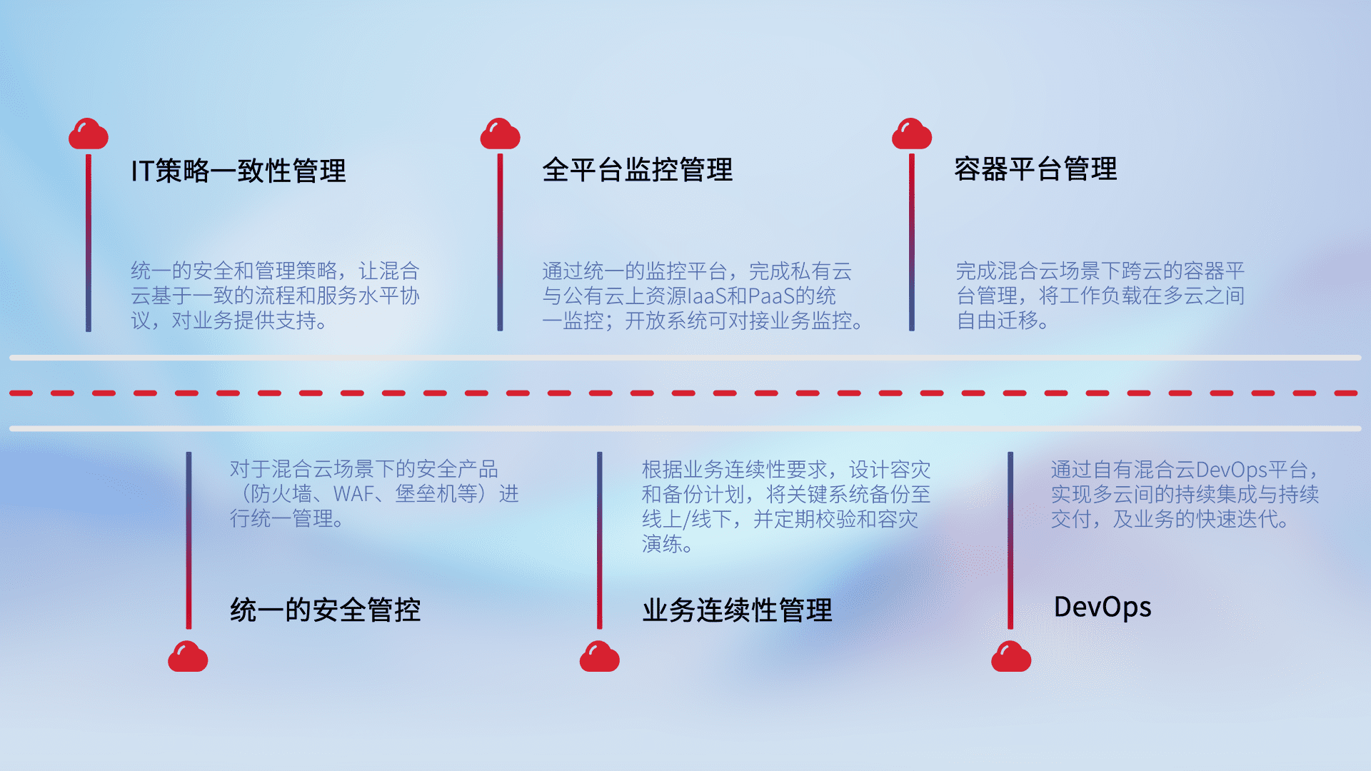 通过多云纳管,,以统一的资源数据模型把客户的云资源进行抽象和封装,,,进而实现对多云资源的统一操作,,,保障云资源管理的可靠性、、、稳定性与可用性。。。。量身定制化运维内容,,配置、、开发运维、、、、补丁管理、、、备份、、监控、、、、认证和访问管理、、审计和日常巡检等,,,,保障在用云过程中的可靠度,,,,稳定度以及高可用率。。