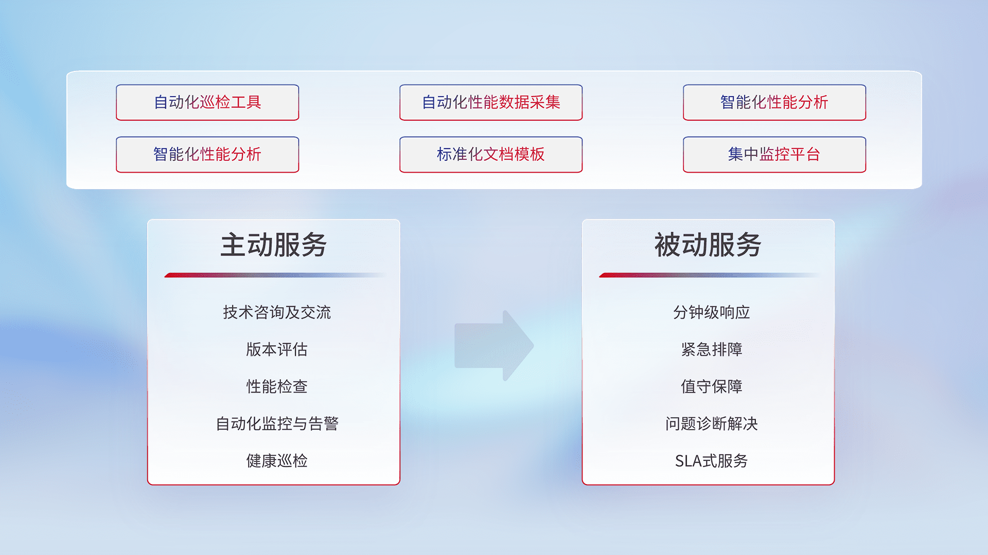 智能化工具和标准化文档,,保障服务质量,,,,提供主动服务(包含技术咨询、、、、版本评估、、、、性能检查、、、、自动化监控与告警、、、、健康巡检)和被动服务包含(分钟级响应、、、、紧急排障、、、、值守保障、、、、问题诊断解决、、SLA服务)。。