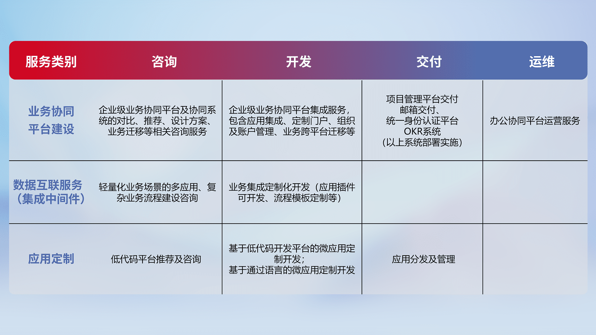 针对钉钉、、、企微、、、IDaas等平台级产品提供产品的规划、、、、方案、、、、交付、、、、定制化开发等服务,,实现如统一协同办公、、智能客户服务、、混合会议管理、、、、智能数据查询、、等业务场景,,,,实现数字化转型。。。。